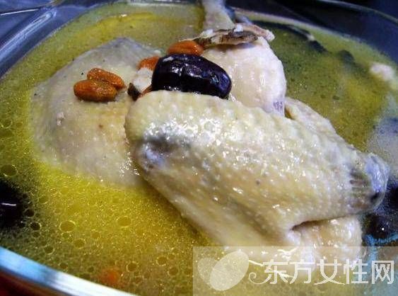 「原料」黄芪50克,枸杞15克,红枣10个,母鸡1只(1000克左右),生姜2片,盐、米酒适量。