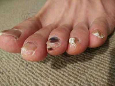 2、灰指甲,灰指甲一开始表现为甲的远端甲板面出现不规则的小片白斑,随后变成无光泽的灰斑,并逐渐变为黄棕色直至黑色。不久甲板变质,甲下角质碎屑堆积、甲床增厚。