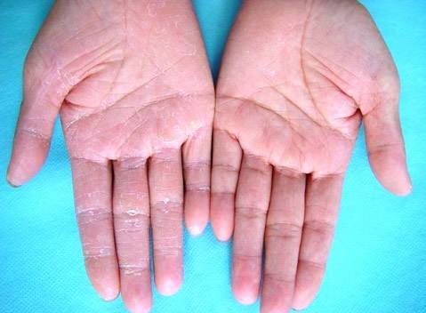 鳞屑角化型、水疱型、擦烂型。鳞屑角化型主要表现为皮肤角化过度、粗糙无汗、干燥、有鳞屑、角化和破裂,可引起疼痛。水疱型表现为散在或群集的深在性小水疱,发生在掌跖或指(趾)间,自觉症状为剧烈瘙痒。