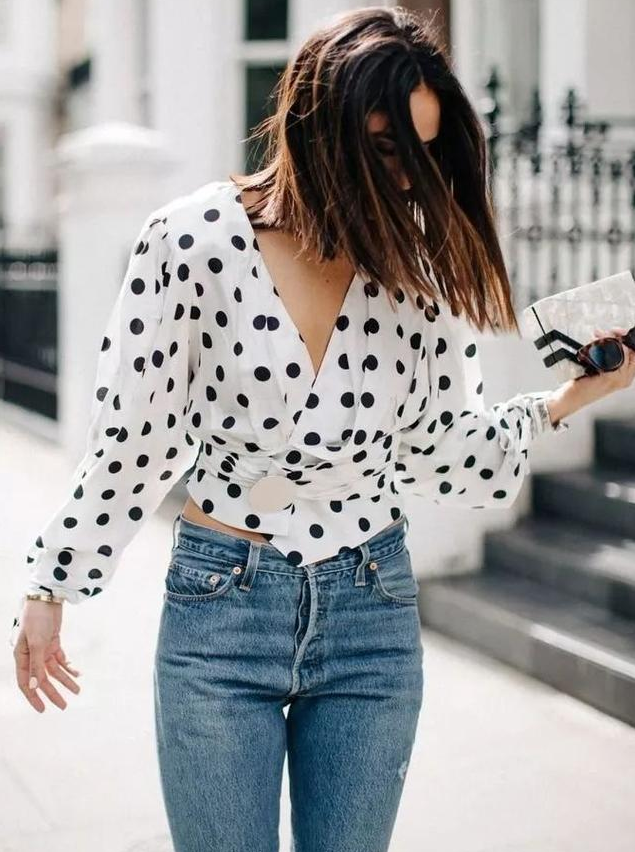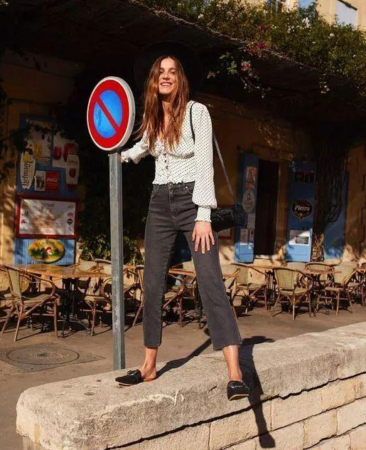 反之如果是黑底白点衬衫,裤子可以考虑搭配浅色的高腰牛仔,气质一样优雅随性!