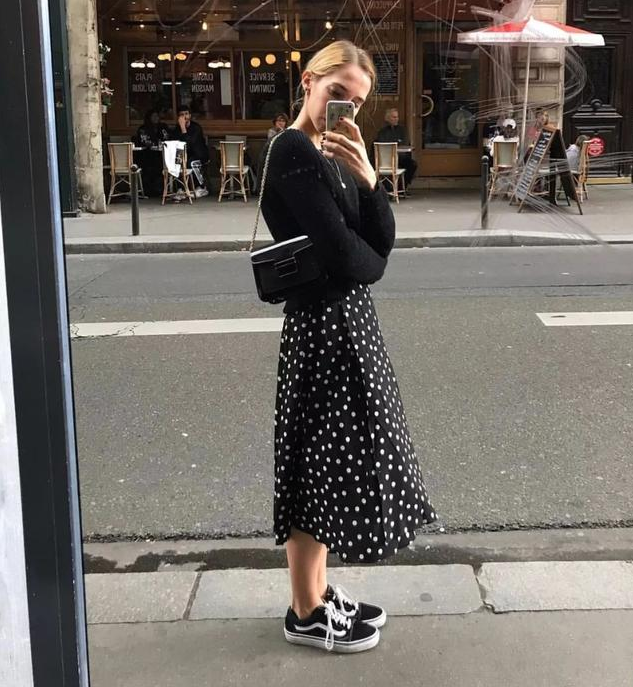 黑底白点半裙,上装可以搭配黑色线衣,或者白色T恤,均可。清爽飘逸,还特有文艺气息。