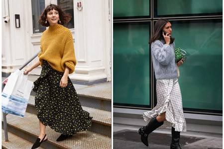 半裙需要有上宽下窄的搭配来凸显比例和身材。法式优雅离不开小碎花裙,花边设计的裙摆从腰间就开始有延伸出层次。黑底色在夏天显得过于沉重,在冬天的清冷之下就恰到好处了。橘黄色小花和黄色毛衣十分相配。毛衣卷起宽松的袖口和衣摆,显得腰身更加苗条。同样飘逸的还有缎面。缎面的高贵感和复古波点相结合,荷叶边修饰分叉设计。灰蓝色的柔软毛衣毛绒感强,圆筒形口袖管局哟偶宫廷感,花纹虽然简单但是有立体感。的缎面非常显形,如果臀部比较宽的女生最好搭配长毛衣加以遮挡。黑色长筒靴接近膝盖,脚脖子上的搭环装饰斜面,黑靴的精巧和整体更加搭配。