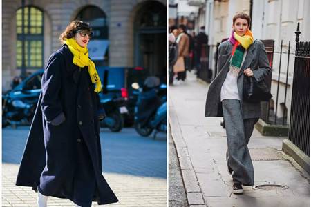 彩色的围巾同样要选择纯色外套会更加突出,灰色西服套装搭配上多色围巾,利落的短发更加突出五官,在冬日展现出迷人风情。亮黄色的围巾将色彩主要集中在上半生,厚重的穿搭也不会暗沉。