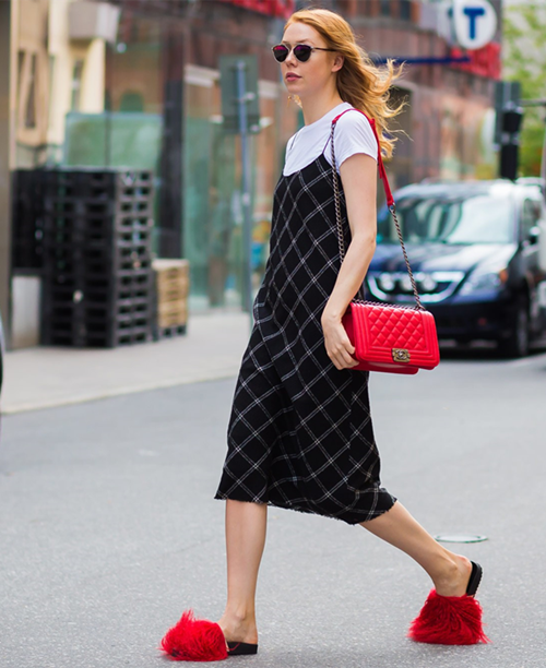 极简的黑白穿搭大法,黑色方格吊带裙,记得用红色配饰来点缀哦。
