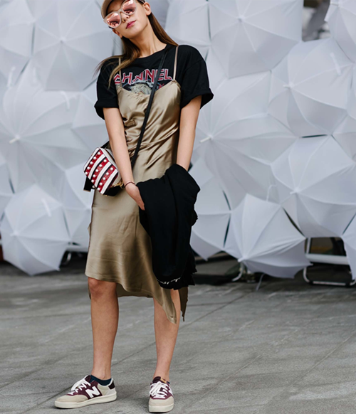 吊带裙搭配小白鞋,将一身娘man气质中和,少女运动感十足。