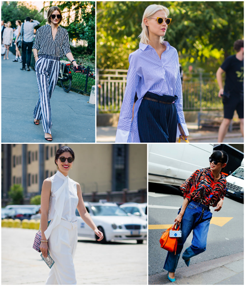 职场lady偏好衬衫+时髦阔脚裤,一秒提升优雅气质。时髦星人们也可以尝试条纹阔脚裤,随性又帅气。