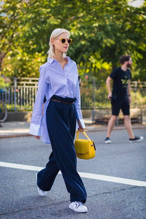 从时装周传来的时尚气息,蓝白条纹衬衫搭配束腰阔脚裤,释放男友力,一秒超越帅男友。亮眼的黄色宝宝+橙框黑墨镜太扎眼,人群中最为你闪耀,搭配上小白鞋帅到没朋友。