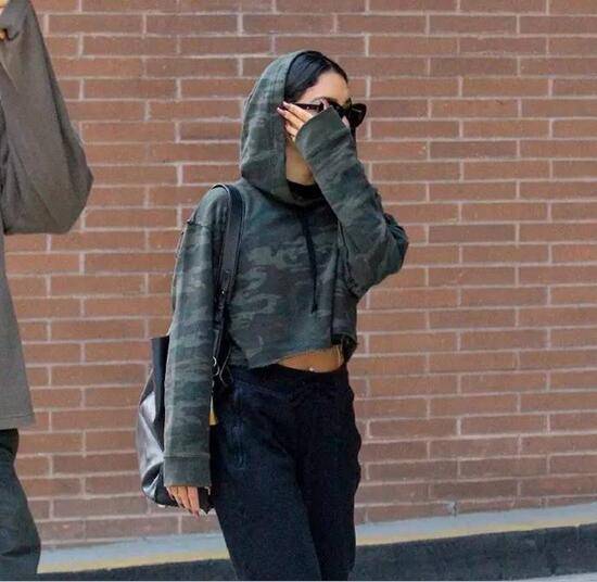 Vanessa Hudgens这一身暗色穿着显得低调但又耐看,休闲运动风格迷彩上衣搭上黑色休闲裤短款上衣露出小肚脐,低调的同时又很酷。