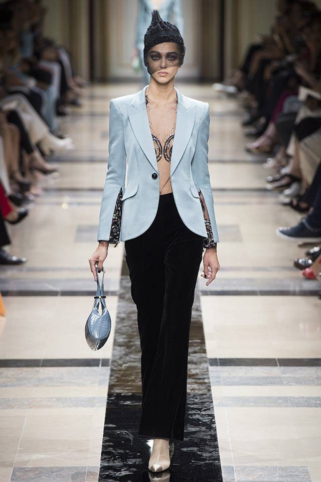 作为高定成衣化的杰出选手,armani的经典之作西服依旧作为开场出现。这些曾经笔挺硬朗的职业装束在armani的设计下,被赋予了更多温柔,精致与优雅在其中。做了一点小改变的职业装更是令人眼前一亮,不再古板沉重,且缩小了衣服与人的距离感,柔和的色彩中和了职业装特有的咄咄逼人和拒人千里外的疏离, 高级的质感和点睛的配饰让原本的精悍女装散发出高雅而温柔的贵族气息。