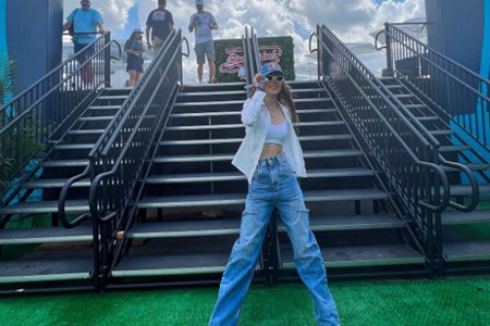 在另一张照片中,谷爱凌更是戴上墨镜狂炫自己的大长腿。简单的白色背心搭配破洞牛仔裤,上短下长的搭配充分展现了谷爱凌近乎完美的身材比例,再加上阳光下灿烂的笑容,元气运动少女气息扑面而来。