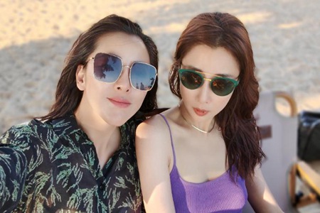 合照中,只见女神殷桃打扮清凉,穿着紫色的低胸吊带,戴着墨镜,头发披散着,皮肤白皙无赘肉,而旁边的黄小蕾则是穿了一件黑色花纹的衬衫,同样带着墨镜,两个大美女的合照确实是非常的养眼的。