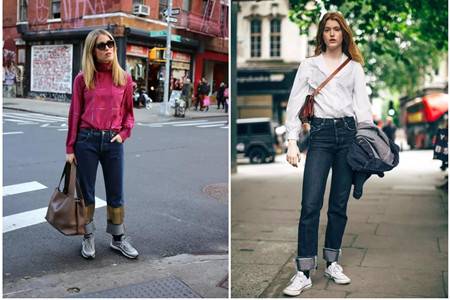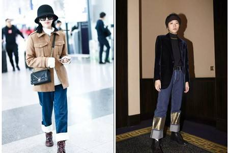 各路女星也在身体力行的演绎翻边裤的时尚感。景甜的各式翻边裤经常出现在街拍之中,本身腿直比例好的她还是非常热衷于阔腿裤,看来还是舒服最重要了。白色高领毛衣简单内搭和棕色外套非常有牛仔的感觉。深色牛仔白色翻边呼应上衣又十分清新。高筒靴拼接材质酒红色质感满分。搭配优雅小黑帽,低调不适时尚感。