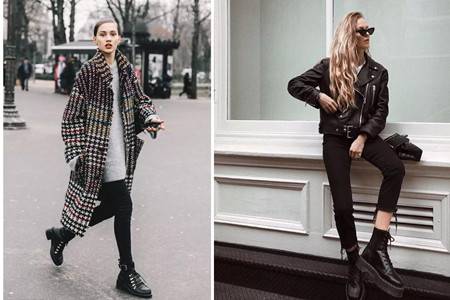 长度的选择,刚好覆盖在脚踝之处的短靴是最好驾驭。一般是八孔的系带恰到好处。更高的靴子在小腿部位,容易暴露腿型缺陷,而且系带太多容易显得复杂厚重感,分割小腿的线条容易显得腿短,适合模特身材女生尝试。说到高度就不得不提到面料了。马丁靴最初是辅助病人行走的鞋子,所以流行起来的也是塑形极强的硬挺面料,比如漆皮。这一种面料的对于腿型有很好的修饰效果,尤其是短靴可以掩盖小腿的粗壮,带来腿部纤直的视觉感受,具有潇洒的朋克风格。软面料的马丁靴更加柔和,个人温暖的感觉,塑形力不强避免过高的长度。