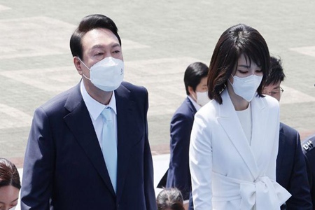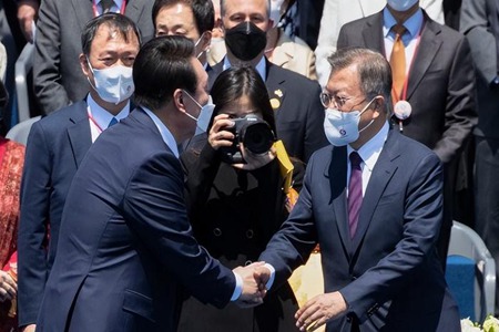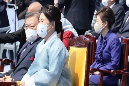阳光正好,4万人列入的就任仪式,除戴着口罩,与往年看上去没有辨别,看上去喜庆。听说,4万人中的2万人是接收约请的佳宾,中国的副主席,日本的外相,美国副总统的外子,齐聚一堂,意味着韩国总统府的两只金色凤凰在投影中优雅地飞舞。