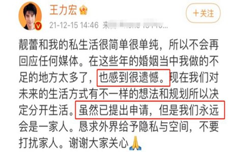 王力宏微博发文认可离婚