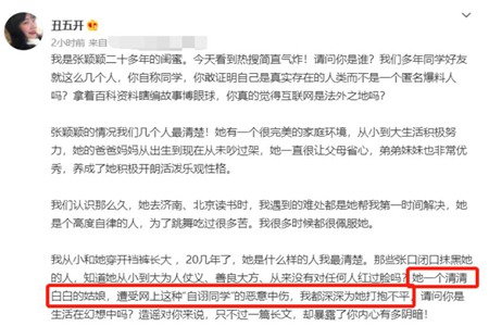 6月2日,一名宣称是张颖颖二十多年的闺蜜的人(丑五开),在社交平台上发长文为张颖颖打抱不平。重要内容有: