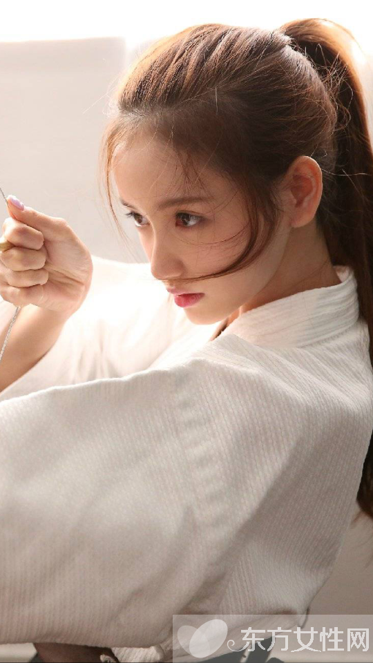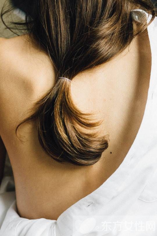 step1:梳理好中长发,刘海两边留一点发丝修饰脸型,其他的头发全部集中到后面,向左侧扭转。
