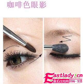 1、咖啡色的眼影,能突出眼凹,采用阴影来放大眼形。