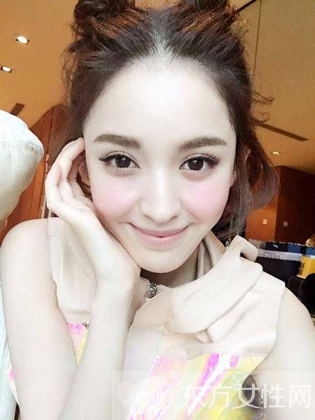 古力娜扎粉色的腮红搭配俏皮的丸子头,真是可爱的不要不要的。