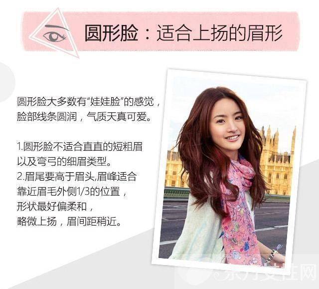 然后我们在看看下我们的圆脸,圆脸的话,一般是比较适合上扬的眉形,相关的技巧,大家可以看下图片的文字介绍!