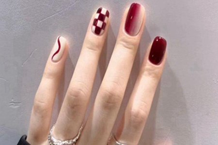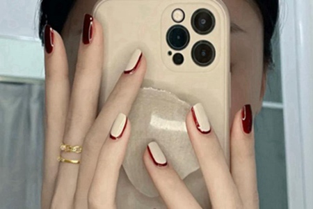 喜好更简约一些的姐妹们,可以选择酒红与奶白色的组合。固然没有太多图案的装潢,但在奶白色的指尖上采取反发式边的设计,简约中带着几分小设计感,高级又耐看。