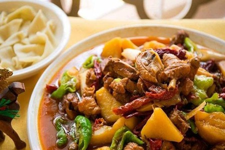 听说20世纪80年月,新疆维吾尔自治区沙湾县农人李某在路边开了一家“满朋阁”饭铺,善于烹制辣子鸡块。由于炒好后的鸡块没那么年夜的盘子装,因而就用盛拌面的盘子盛上。客人吃完后年夜叫过瘾,从此新疆年夜盘鸡拌面盛行于世!