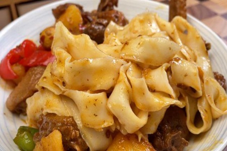 材料:鸡腿4只、年夜葱1根、年夜蒜5瓣、生姜料酒适当、1块八角、1个桂皮、2块喷香叶、4片郫县豆瓣酱、2勺土豆、4个胡萝卜、1根啤酒、1玻璃瓶生抽、2勺老抽、1勺白糖、2块洋葱、1个青辣椒、1个红尖椒、2个裤带面或宽面适当、番茄酱4勺···