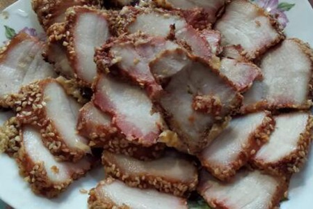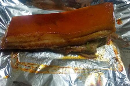 3、烤箱上下火180°预热3分钟,在烤盘上垫一层锡纸,把腌好的五花肉皮面朝下入烤箱,用上下火180°的温度烤10分钟取出。把五花肉翻面,用小刷子把腌制五花肉的酱料平均的给它刷上,五花肉的皮面再刷上一层蜂蜜,然后皮面朝上再入烤箱烤10分钟。烤制10分钟后把五花肉取出,看看皮面是不是酥脆,若是不足酥脆再刷一层蜂蜜,然后撒上辣椒面、孜然粒和芝麻同化的喷香料,入烤箱再烤5分钟至皮脆肉喷香取出,切片后便可食用。