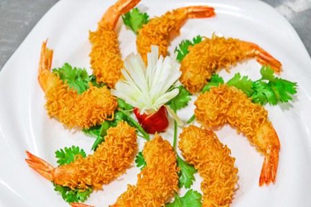 黄金虾,寓意“金玉满堂”。食材需要准备妥虾、随便马虎面、盐、胡椒粉、料酒、淀粉、鸡蛋、椒盐等。