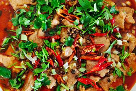 首先,肉切片,尽可能薄点,放入料酒一小勺盐,酱油适当,撒点白胡椒粉,耗油适当抓匀,放入蛋清再抓匀,放油再抓匀,年夜约放置15分钟。然后,先芽菜焯水备用。起锅烧油放入2勺郫县豆瓣酱炒出红油,放入三分之一干辣椒段,三分之一麻椒粒,炒一炒后到场热水适当。