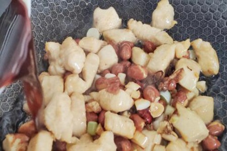 3、由于加了食用油的原因,鸡肉入锅轻轻一推就会撒开,不会粘连在一路,炸制年夜约2分钟,至鸡肉八成熟,捞出控油备用。锅中留少量底油,放入花椒和干辣椒,煸炒出喷香味,特别是辣椒,要炒至外面有焦斑为好,这样喷香味才能丰裕激起出来。到场年夜蒜和年夜葱煸炒出喷香味,接着放入炸好的鸡肉和花生米,快速翻炒平均。倒入提早准备妥的料汁,中火翻炒半分钟,至鸡肉上色,料汁浓稠,便可出锅。若是喜好酸甜口胃重一点的,可以按比例增加醋和糖的用量。炸花生米全程小火,且中途搅拌,能够避免夹生,同时上色平均。