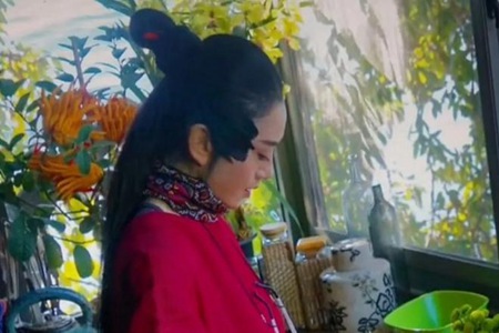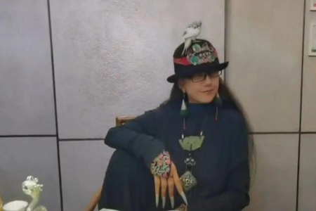 视频中可以看到,杨丽萍照旧是古朴的平易近族打扮,藏蓝色的袍子十分朴实,胸前佩戴的玉佩加倍显得她气质优雅,手上的指甲更是迥殊的抢镜。不外,多是聊天太太高兴,她的脚踩在椅子上,有着梁山英雄的感受,头上顶了一只小鸟,迥殊的放松随便。