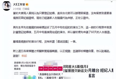 在文章中,年夜s提到一些媒体的不实谈吐,并澄清当初具俊晔来台解决娶亲证实时,遗忘要带无犯法证实,今朝正在请韩国的家人代为解决。至于具俊晔的5月离台,是早前就谈好的去纽约工作,这一趟行程就只申请了60天的入台签证。离开台湾是为了去纽约表演,而不是所谓的遣返回国。