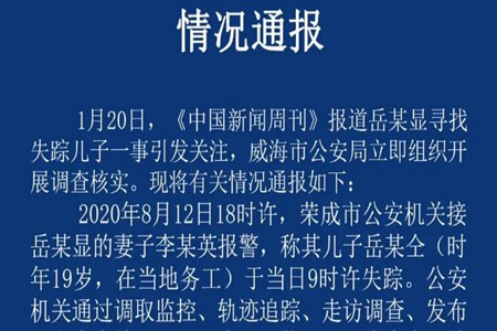 21日,警方发布最新新闻,称2020年8月26日,荣成市公安机关接到大众报警,在当地一水库内发现一具高度堕落的男性尸首。经法医现场勘查,尸首考验和外围查询造访,未发现有犯法事实存在,不符合立案条件。