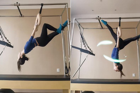 视频中,央视主持人李思思身穿一套黑色紧身活动装,正站在健身房的蹦床上进行高难度的演习。只见她身姿轻巧而柔嫩,直接扶着头上吊栏来了个“太空信步”,进行了高难度的倒立劈腿,身体柔韧度惊人令人赞叹。