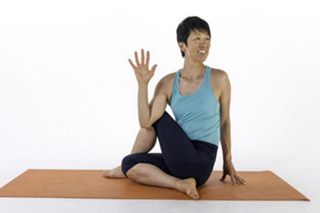 最后,将右手放在小腿、脚踝或右脚外侧的地上,尽可能不要扭曲躯干两侧,将左臂伸向天花板,连结头部中立或向左迁移改变,眼睛谛视左手拇指,连结姿式30秒到1分钟。