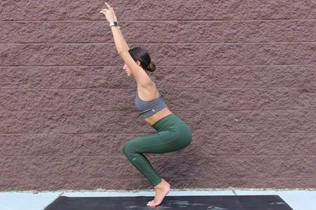 身体站在竖直垫子前的三分之一处,双脚分开双手前平升,臀部慢慢下沉往后坐,就想幻椅式是感觉下边有一张凳子。腰背挺直向前折叠靠近自己大腿,整个身体在一个平稳的状态中呼吸三次之后直起身体恢复到站立姿势。